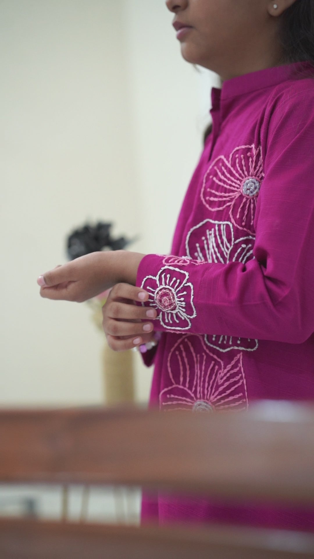 Elevate your daughter's wardrobe with this exquisite hand-embroidered khaddar co-ord set in rich magenta. Crafted from premium khaddar fabric, this two-piece ensemble features intricate traditional embroidery work that showcases authentic craftsmanship. The coordinated top and bottom design offers effortless styling for special occasions, celebrations, or everyday elegance. Perfect for girls who appreciate quality textiles and timeless designs, this set combines comfort with sophisticated aesthetics. Ideal for festive seasons and cultural events.